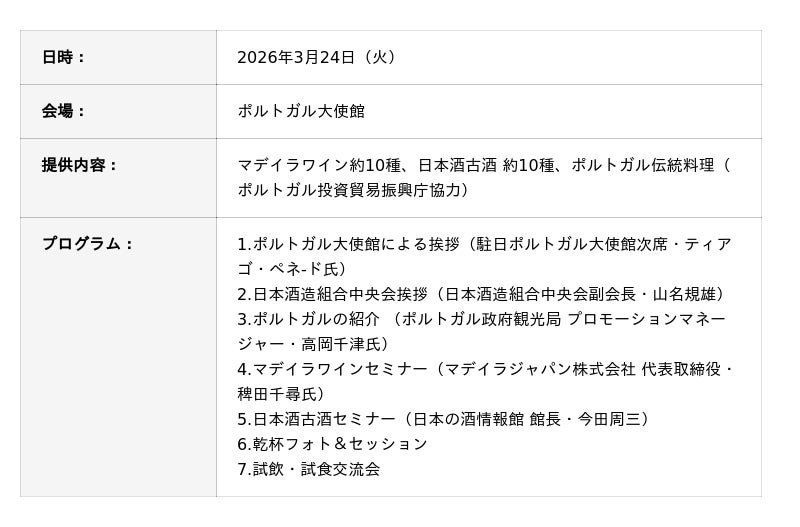 このたび、3月24日、中央会は、ポルトガル大使館、ポルトガル政府観光局、ポルトガル投資貿易振興庁、およびマデイラジャパン株式会社の協力のもと、日葡文化交流イベント「マデイラワインと熟成日本酒 セミナー&試飲会」を開催しました。本イベントでは、マデイラワインおよび日本酒 各10種に加え、大使公邸シェフによるポルトガル料理が提供され、日葡両国の酒文化と食文化が交差する場となりました。