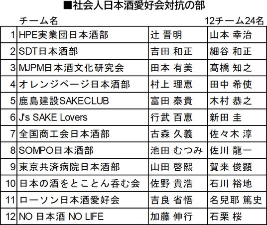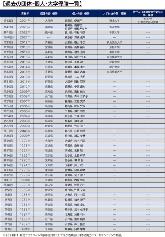 なお、全国大会の出場選手数は計73名(予定)となり「一般の部」の代表選手は「個人戦」と、2名の合計点で競い合う「団体戦」の2カテゴリーで”きき酒日本一”の座をかけます。