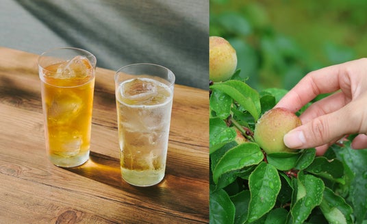 左:「渉成園」の梅を漬け込んだ「梅シロップ」を使ったドリンク 右:渉成園での梅狩りの様子