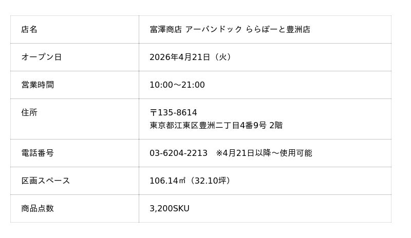 日本最大級の製菓・製パン材料、器具専門店として創業107年の株式会社富澤商店は、2026年4月21日(火)に「富澤商店 アーバンドック ららぽーと豊洲店」をオープンいたします。