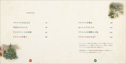 クリスマスのはじまり、中世のクリスマス、サンタクロースの伝説、クリスマスを祝う、クリスマスを飾る、おいしいクリスマス、クリスマスの植物と小鳥、クリスマスのひろまり