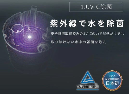 1.UV-C除菌をはじめとしたカルテット除菌システムで、いつでも清潔なスチームを