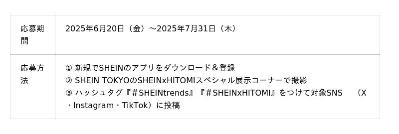 HITOMIさんのSHEIN 2025年度 夏シーズンモデル就任を記念して、SHEIN JAPAN初となるフォトカードキャンペーンやショールーム限定のアルバムキャンペーン、シーズンモデル就任記念クーポンでお得にSHEINの商品がご購入いただけるキャンペーンを実施いたします。さらに、SHEIN公式SNSで指定ハッシュタグを付けて投稿した方の中から抽選で、SHEINでご利用いただける30,000円分のギフトカードや、HITOMIさんの着用コーディネートをプレゼントいたします。