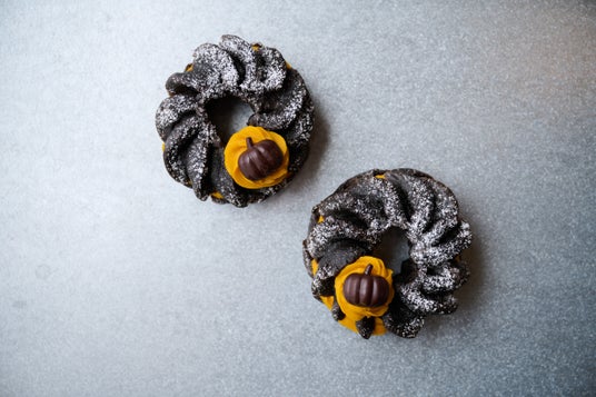 ブラックココアを混ぜ込んだ真っ黒なフレンチクルーラー生地は、しっとりとした口あたりとほろ苦さが魅力。そこに重ねたのは、少し甘めに仕上げた濃厚なかぼちゃクリーム。