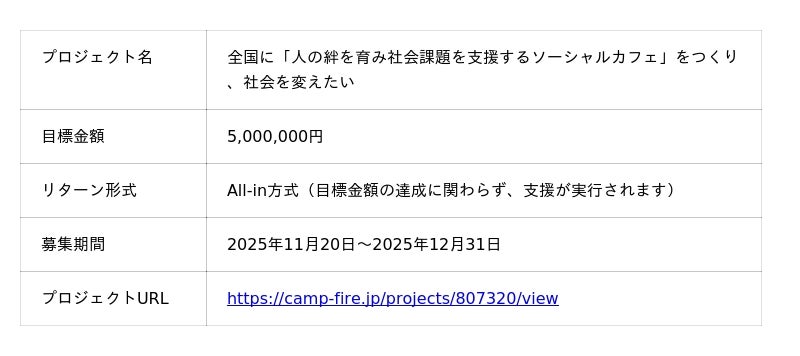 孤独や社会の分断といった社会課題の解決を目指し、地域課題解決型の「Social Cafe & Bar OnOkuri」の全国展開に向けた資金を募るため、2025年11月20日よりクラウドファンディングを開始いたしました。クラウドファンディングプラットフォーム「CAMPFIRE」にて、年内2025年12月31日まで支援を募集しています。短期間のチャレンジとなりますが、私たちの取り組みを多くの方に知っていただけると嬉しく思います。