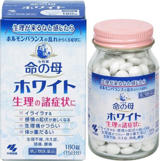 販売名:女性薬 命の母ホワイト(第2類医薬品) メーカー希望小売価格(税抜):180錠 2,568円 効能・効果:月経痛、月経不順、ヒステリー、腰痛、頭痛、貧血、冷え症、血の道症(注1)、肩こり、めまい、動悸、こしけ(注2)