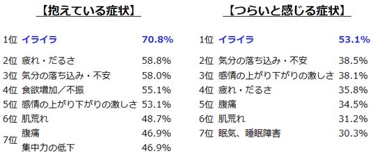 PMSを抱えている女子高生に具体的な症状を聞いたところ、トップは「イライラ(70.8%)」、次点に「疲れ・だるさ(58.8%)」「気分の落ち込み・不安(58.0%)」が続きました。つらいと感じる症状では、「イライラ」「気分の落ち込み・不安」「感情の上がり下がりの激しさ」など精神面での変化が上位を占める結果となりました。