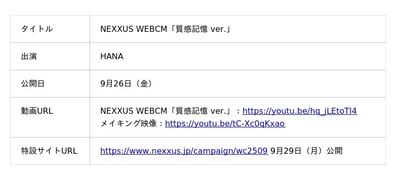 ユニリーバ・ジャパン・カスタマーマーケティング株式会社(本社:東京都目黒区、代表取締役 社長:エド・ブリオラ)は、ヘアケアブランド「NEXXUS」のリニューアルを記念し、7人組ガールズグループHANAとのコラボレーションプロジェクトを展開。HANA出演のNEXXUS WEBCM「質感記憶 ver.」を2025年9月26日(金)より公開します。