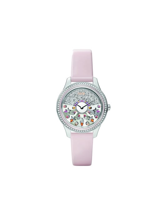 ・ステンレススティール製ベゼルに71石のラウンドカットダイヤモンド (0.71ct)をセットし、ピンクのマザーオブパールリングで装飾