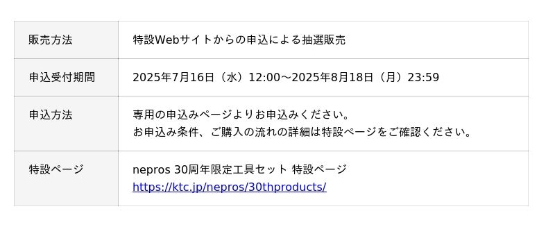 総合ハンドツールメーカー京都機械工具株式会社(KTC)(京都府久世郡久御山町/代表取締役社長 伊吹 和彦/証券コード5966)は2025年7月16日より、「 nepros 30周年限定工具セット」の抽選販売受付を開始いたします。