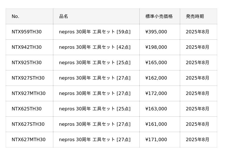 製品ラインナップの詳細は nepros 30周年限定工具セット特設ページ をご確認ください。