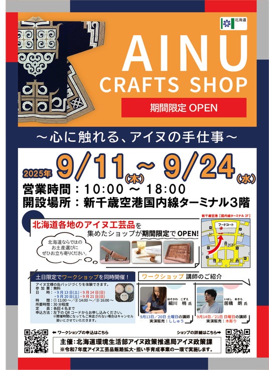 アイヌ工芸品を販売するポップアップストア「AINU CRAFTS SHOP ~心に触れる、アイヌの手仕事~」が、新千歳空港にて、2025年9月11日(木)から9月24日(水)までの期間限定でオープンいたします!