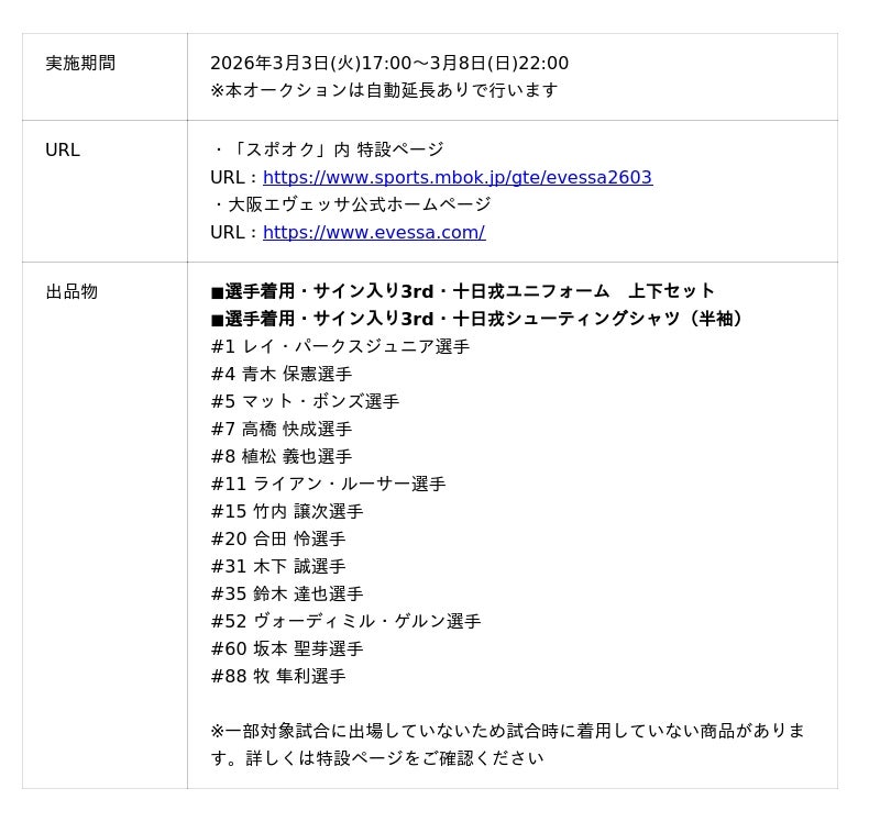 【大阪エヴェッサ 「情熱の赤シリーズ」十日戎オークション 概要】