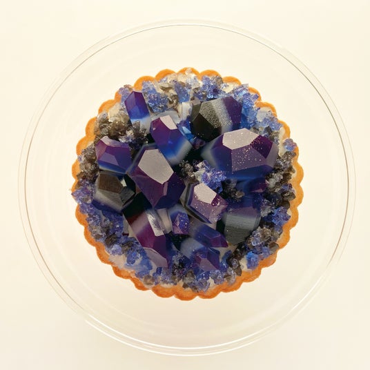 12月の誕生石を手切りの琥珀糖で表現。表面はシャリっと、中はぷるんとした食感がおもしろい。