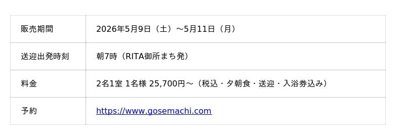全4室の古民家宿「RITA御所まち」では、朝7時に宿を出発し混雑前にツツジを鑑賞できる送迎付きプランを、昭和レトロな「宿チャリンコ」では電動自転車で山麓を走るアクティブなプランを提供します。いずれのプランも、宿から徒歩数分の銭湯「御所宝湯」のフィンランド式サウナとお風呂をご利用いただけます。