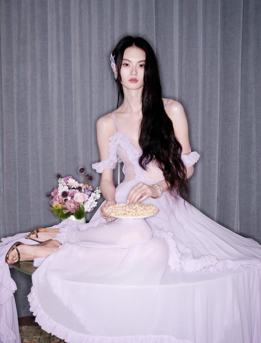 2025年秋冬コレクションより、フローラルレースをあしらったライラックのシルクジョーゼット レイヤードオープンバックドレスを着用しています。