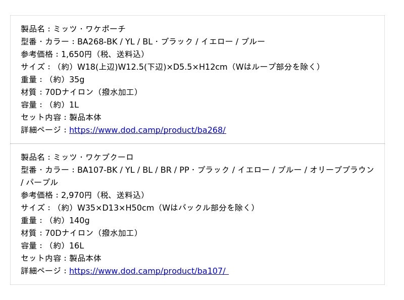 ビーズ株式会社(本社:大阪府東大阪市、代表取締役社長:大上響)が展開するアウトドアブランドの「DOD」は、3気室構造で仕分けのしやすさと取り出しやすさを両立したポーチ「ミッツ・ワケポーチ」と、SNSで話題となったお風呂バッグ「ミッツ・ワケブクーロ」の新色パープルとオリーブブラウンを2025年12月5日より発売しました。