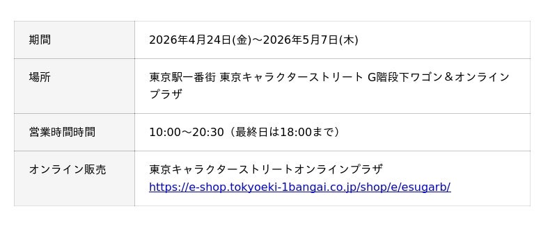 さまざまなキャラクターグッズを企画・販売している株式会社KThingS(東京都中央区)は、東京駅一番街 東京キャラクターストリート G階段下ワゴン&オンラインプラザにて『シュガーバニーズPOP UP STORE×むにゅぐるみパティオ』を、2026年4月24日(金)~2026年5月7日(木)の期間で開催いたします。