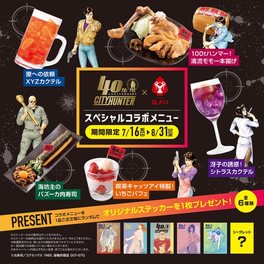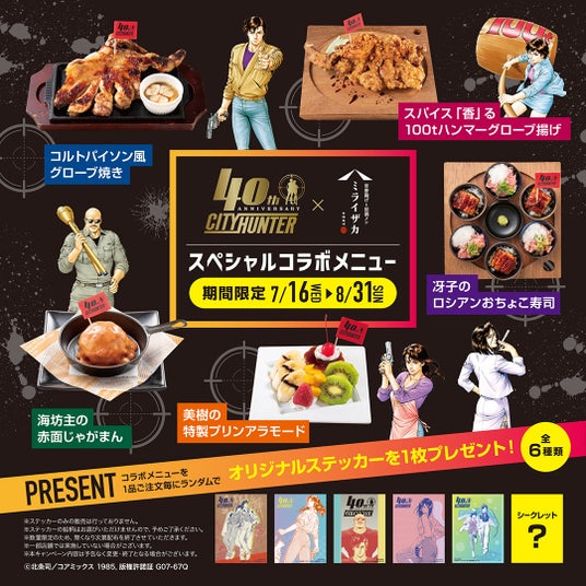 漫画『シティーハンター』が、2025年2月26日(水)に連載開始から40周年を迎えました。これを記念して、現在「シティーハンター40周年プロジェクト」が進行中です。1985年の「週刊少年ジャンプ」連載開始以降、冴羽獠のハードボイルドな活躍とコミカルな魅力で多くのファンを魅了してきた本作は、アニメ化や実写化を経て、世代を超えて愛され続ける国民的コンテンツとなりました。ワタミでは、この『シティーハンター』のアニバーサリーイヤーを盛り上げるべく、ブランドの枠を超え、「ミライザカ」「三代目 鳥メロ」「焼肉の和民」「TGI フライデーズ」の4ブランド合同で、「シティーハンター40周年 × ワタミコラボフェア」の開催を決定しました。