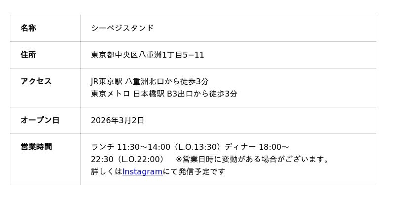 合同会社シーベジタブル(共同代表:蜂谷 潤、友廣 裕一、本社:高知県安芸市)は、2026年3月2日(月)、東京・八重洲/日本橋エリアに同社初の常設飲食店「シーベジスタンド」をオープンします。昼は海藻ラーメン、夜は海藻ラーメンに加えて海藻料理や海藻を使ったお酒なども楽しめる酒場として営業し、海藻の魅力を広める新しい食文化を発信します。