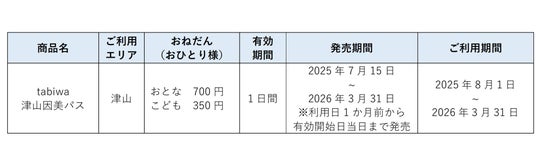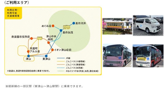 本協定に基づく具体的取組みの1つとして、因美線沿線地域における公共交通の便数増加や乗継改善といった利用者ニーズに応えるため、JR因美線・並行するバス路線(ごんごバス加茂線)、津山駅周辺の循環バス(ごんごバス東循環線、ごんごバス小循環線)、予約型乗合交通(のるイコつやま)といった公共交通を自由に組み合わせてご利用できる1日乗り放題の便利な切符「tabiwa津山因美パス」をお得な価格で発売いたします。