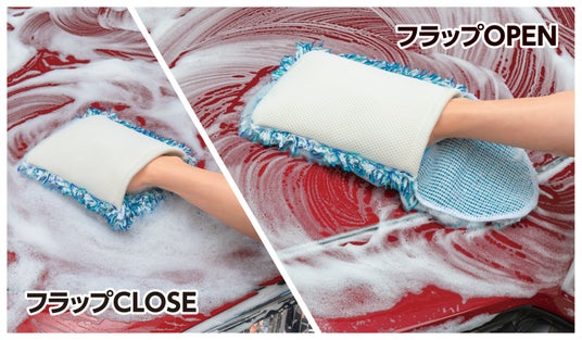 フラップを広げて使うことによりボンネット、ルーフなどの広い箇所もラクラク洗浄できます。また、フラップを収納することでフィット感の調整も可能です。