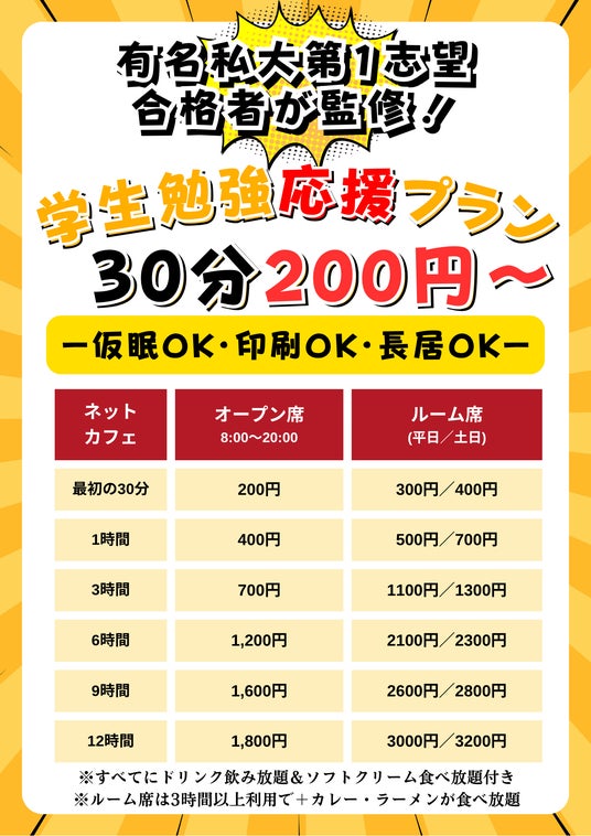 有名私大第1志望合格者が監修!大宮にあるネットカフェで、2025年11月7日(金)よりドリンク&ソフトクリーム飲み放題付き&集中・リラックスできる学習環境とサービスを提供