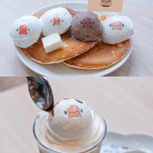 ホットケーキにホイップの文鳥を並べたり、チョコでお絵描きしたりカスタマイズ要素もいっぱい♪