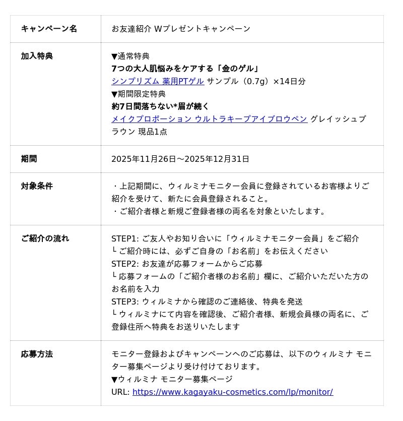 株式会社ウィルミナ(本社:東京都新宿区、代表取締役:幸村潮菜、以下ウィルミナ)は、日頃よりご協力いただいているモニター会員の皆様とともに、より良い商品づくりを進めています。この度、モニター活動をさらに活性化させるため、2025年11月26日から2025年12月31日まで「お友達紹介 Wプレゼントキャンペーン」を実施いたします。