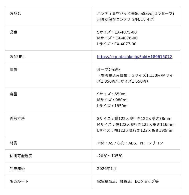 株式会社シー・シー・ピー(東京都台東区、代表取締役社長:横治 一也)は、『ハンディ真空パック器 SelaSave用真空保存コンテナ S/M/L サイズ』を2026年1月より家電量販店、雑貨店、ECショップなどにて発売いたします。